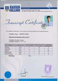 In United States education, a transcript is a copy of a student's permanent academic record, which usually means all courses taken, all grades received, all honors received and degrees conferred to a student from the first day of school to the current school year.[1] A transcript may also contain the number of people in a class, and the average grade of the class. An official transcript is prepared and sent by the issuing school usually by the Student Registrary with an original signature of a school official on the school letterhead and is sealed by the school. When students are thinking about changing schools, the cumulative transcripts get mailed from school to school. Transcripts usually consist of grades 9-12 when applying to colleges. Transcripts are most often issued and used at the high school (grades 9-12) and university levels.