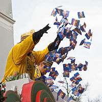Every year there are 3 people (the Dreigestirn[1]) who are granted the titles of Jungfrau, Prinz, and Bauer (virgin, prince and farmer), who pay a large sum of money for their privileges. The carnival prince is deemed to be the highest representative of the festivities, leading the main parades throughout the week. Traditionally, the Jungfrau ("Virgin") is always portrayed by a man dressed as a female.