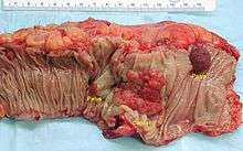 A colorectal polyp is a polyp (fleshy growth) occurring on the lining of the colon or rectum.[1] Untreated colorectal polyps can develop into colorectal cancer.[2]