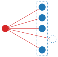 The diagram below shows one possible (F · G)-structure on a set with five elements. The F-structure (red) picks up three elements of the base set, and the G-structure (light blue) takes the rest. Other structures will have F and G splitting the set in a different way. The set (F · G)[A], where A is the base set, is the disjoint union of all such structures.