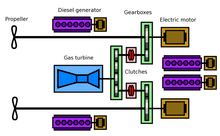 Combined diesel-electric and gas (CODLAG) is a modification of the combined diesel and gas propulsion system for ships. A variant, called the combined diesel-electric or gas (CODLOG) system, contains the same basic elements but will not allow simultaneous use of the alternative drive sources.[1]