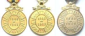 The medal was initially awarded to civil servants with a minimum of 20 years of honourable service between 1865 and 1905 who were eligible for the Civic Decoration for long service.[1] It was reissued slightly modified (see description below) in 1951 at the request of veterans' groups, to veterans and military personnel who had a minimum of one year's good and faithful service between 16 December 1865 and 18 December 1909.[2] The medal was once again reissued for a third time in 1952, again slightly modified, to members and veterans of the Force Publique who also had a minimum of one year's good and faithful service between 1 July 1885 and 18 December 1909.[3] The one year's minimum service requirement was later removed by royal decrees in 1959 and 1960.
