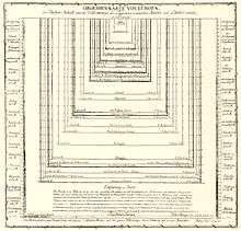 Another root of comparison diagrams are the earliest thematic maps. Late 18th century August Friedrich Wilhelm Crome published one of the first economic thematic map.[5][6] His "Groessen Karte von Europa" from 1785 compared the sizes of all then existing European countries. This work inspired later scientist, such as Alexander von Humboldt in Germany,[7][8] and Charles Dupin in France.[9] in their works. In France in 1872 Charles Louis de Fourcroy presented a similar diagram, which he named "Table Poléométrique" (Poleometric Table).[10]
