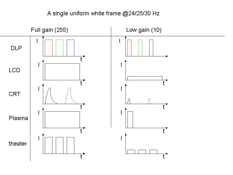 The figure shows a sketch of how different technologies present a single white/grey frame. Time and intensity is not to scale. Notice that some have a fixed intensity, while the illuminated period is variable. This is a kind of pulse-width modulation. Others can vary the actual intensity in response to the input signal.