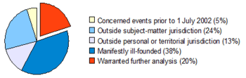 Every time a complaint is received, the Prosecutor must "analyse the seriousness of the information received"[6] and decide whether there is a reasonable basis to open an investigation. The process begins with an initial review, during which many of the communications received are dismissed as "manifestly outside the jurisdiction of the Court". Of the communications received before 1 February 2006, 80% were dismissed for the following reasons: