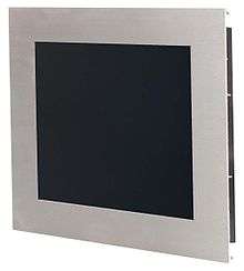 A panel mount computer monitor is intended for mounting into a flat surface with the front of the display unit protruding just slightly. They may also be mounted to the rear of the panel. A flange is provided around the LCD, sides, top and bottom, to allow mounting. This contrasts with a rack mount display where the flanges are only on the sides. The flanges will be provided with holes for thru-bolts or may have studs welded to the rear surface to secure the unit in the hole in the panel. Often a gasket is provided to provide a water-tight seal to the panel and the front of the LCD will be sealed to the back of the front panel to prevent water and dirt contamination.