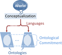 Chart showing the relation between a conceptualization in information science, its various ontologies (each with its own specialized language), and their shared ontological commitment.[1]