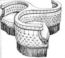 A confidante (also known[1][2] as a canapé à joue, a canapé à confidants, or a canapé à confidant(e)) is a type of sofa, originally characterized by a triangular seat at each end, so that people could sit at either end of the sofa and be close to the person(s) sitting in the middle.[3] The ends were sometimes detachable, and could be removed and used on their own as Burjair chairs.[4][5] The name Confidante was coined by cabinetmaker George Hepplewhite,[6] who described it in his Cabinet-Maker and Upholsterer's Guide as being "of French origin, and is in pretty general request for large and spacious suits of apartments. An elegant drawing-room, with modern furniture, is scarce complete without a Confidante, […]".[7]