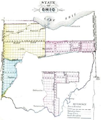 Congress Lands in northwest Ohio consist of North and East of the First Principal Meridian and South and East of the First Principal Meridian. These lands are south of a narrow strip next to the Michigan border, west of the Firelands and the Congress Lands North of Old Seven Ranges, North of the Greenville Treaty Line and the Virginia Military District, and east of Indiana. Townships are surveyed north and south from the baseline at 41 degrees north, and are designated “Township X N, Range Y E of First Principal Meridian” or “Township X S, Range Y E of First Principal Meridian”.