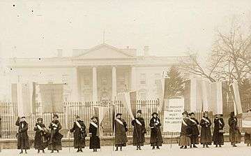 The NWP pickets were then widely criticized for ignoring the World War and attracting radical anti-war elements.[2] The pickets were later arrested on the charge of obstructing traffic, and in prison, some went on hunger strikes.[3] Abusive treatment of the protesters, who called themselves political prisoners, angered some Americans and created more support for the suffrage amendment. They were released and their arrests were later declared unconstitutional. In the meantime, NAWSA helped pass the 1917 referendum in New York State in favor of suffrage. In early 1918, Wilson came out in favor of the amendment, and it passed the House, but failed in the Senate despite another round of protests and arrests. After the NWP helped replace anti-suffrage senators in the 1918 elections, the amendment finally passed both houses and was sent to the states for ratification. The Nineteenth amendment was ratified by enough states by 1920, thus giving women the vote.