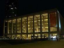 Aaron Copland wrote Connotations to fulfill a commission from Leonard Bernstein for the opening concert of the New York Philharmonic's new home in the Lincoln Center for the Performing Arts.[3] Since this hall was slated as the first part of Lincoln Center for completion, its inauguration was considered especially momentous. Among the guest list of 2600 for the first concert and the white-tie gala which would follow it were John D. Rockefeller III (chairman of Lincoln Center), Secretary of State Dean Rusk, Governor and Mrs. Nelson Rockefeller, United Nations Secretary General U Thant and prominent figures in the arts that included of Metropolitan Opera General Manager Rudolf Bing, violinist Isaac Stern and actress Merle Oberon.[4][5] Noted composers would also attend included Samuel Barber, Henry Cowell, Roy Harris, Walter Piston, Richard Rodgers, William Schuman and Roger Sessions.[6] United States President John F. Kennedy and his wife Jackie had also been invited. Their initial inability to attend caused some consternation, since they had voiced their support for American culture. At the last minute, Jackie Kennedy said she would be there.[7]