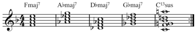 For example, the progression Fmaj7-A♭maj7-D♭maj7-G♭maj7-C13sus[1] contains four major seventh chords (and one thirteenth chord), none of which are diatonic to the key of F major except the first.