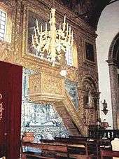 Paintings from the 18th century, framed in gilded-wood, flank each side of the altar: including to the right of the altar, the Menino entre os Doutores(Finding in the Temple), the Fuga para o Egipto (Flight into Egypt) and the Apresentação no Templo (Presentation of Jesus at the Temple); and to the left of the altar, the Visitação (Visitation), the Anunciação pelo Anjo (Annunciation) and the Casamento da Virgem (Marriage of the Virgin), located . The pulpit also in gilded wood, and its small staircase, is within the interior of the nave.