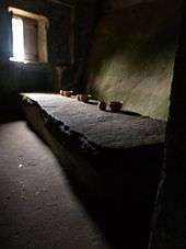 The interior dependencies are aligned along several corridors within the complex, and broken by small steps formed by the slopes on which the convent was built. Many of the spaces are covered in cork, which acted as an insulator (protecting the clergy from the cold humid environment); many of the doors, windows are covered in cork, while the austere floor is composed of stone slabs.[3][4] The personal quarters of the friars, eight in total, are small in size with small entrance-ways and access to the main corridor.[4] Friar António da Piedade, writing in 1728, described the cells as so small that a few of the monks carved portions of the wall, in order to accommodate their feet. The refectory included a large slab that was ordered extracted from the mountains by Henry, King of Portugal and used as a table by the monks, and small cupboard.[4] The relatively small space was connected to the kitchen, with stone and chimney, rock bunks for counters and spaces carved into the rock.[4] The Casa das Águas (House of the Waters) accessible through an exterior corridor to a cistern and spring, was the collection and distribution space for water into the convent, and included a water tank, latrines and urinal.[2][4] In addition, the complex included a space for the novice; an old library with roof covered in cork; an infirmary; hall of penitence; two cells covered in wood; a space for solitude/retreat (located at the highest point in the complex); and the circular Casa do Capítulo, whose access door and walls are decorated in cork, interrupted by a niche.[4]