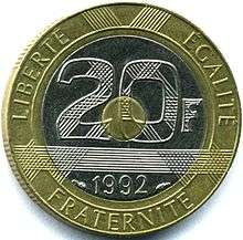 Bimetallic coins are sometimes used for higher values and for commemorative purposes. In the 1990s, France used a tri-metallic coin. Common circulating bimetallic examples include the €1, €2, British £2 and Canadian $2 and several Peso coins in Mexico.