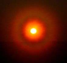 In meteorology, a corona (plural coronae) is an optical phenomenon produced by the diffraction of light from the Sun or the Moon (or, occasionally, bright stars or planets)[1] by individual small water droplets and sometimes tiny ice crystals of a cloud or on a foggy glass surface. In its full form, a corona consists of several concentric, pastel-colored rings around the celestial object and a central bright area called aureole. The aureole is often (especially in case of the Moon) the only visible part of the corona and has the appearance of a bluish-white disk which fades to reddish-brown towards the edge. The angular size of a corona depends on the diameters of the water droplets involved: Smaller droplets produce larger coronae. For the same reason, the corona is the most pronounced when the size of the droplets is most uniform. Coronae differ from halos in that the latter are formed by refraction (rather than diffraction) from comparatively large rather than small ice crystals.
