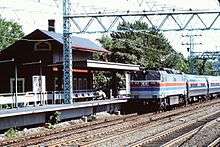 An Amtrak train passing Cos Cob in 1975