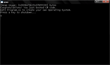 An operating system built with Cosmos is developed in a similar fashion to any .NET C# console program. Additional references are made in the start of the program which give access to the Cosmos libraries. These libraries override the system libraries normally used in C# console programs since the resulting binary won't be running on an installation of Microsoft Windows.
