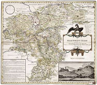The County of Mark (German: Grafschaft Mark, French: Comté de La Marck colloquially known as Die Mark) was a county and state of the Holy Roman Empire in the Lower Rhenish–Westphalian Circle. It lay on both sides of the Ruhr river along the Volme and Lenne rivers.