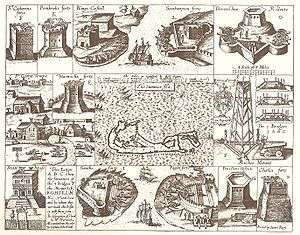 The 'matter-of-factness'/'matter-of-necessariness' of the presence/utility of freemasonry comes out quite remarkably in Jacobs' 'Builders of Empire'; as too does the apparently automatic membership of the Crown's local 'Surveyor-General' to the most respectable lodges of the colonies.[17] The militarily defensive role of the trimoda necessitas is clearly apparent in the John Smith 1624 map of Bermuda showing its fortified and unfortified buildings, artillery emplacements, roads, bridges, waterways and watch tower. Significantly, the State House (bottom left detail of map) has been "rented by the government to the local Freemasons for...one peppercorn annually" since state government business moved from St Georges to Hamilton in 1815.[18]