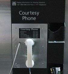 Customers can use a courtesy phone to seek information, such as where to find further transport or a person trying to meet them. Some courtesy phones provide a direct line to a number of advertised businesses, such as motels or taxis.[3][4] They may be located near baggage claim, ticketing areas, and security checkpoints.[5]