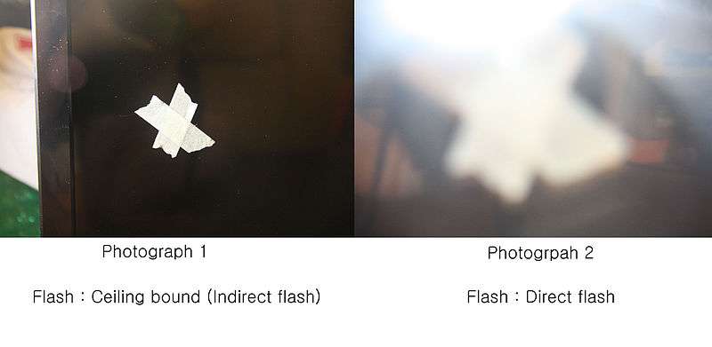 External flash units are helpful tools when responding to a crime scene and for the proper documentation of evidence. The white balance of a photo flash unit is set to mimic daylight to ensure the proper color balance of the subject matter. The photographer must be mindful of the reflections that can occur due to the directionality of the flash and the position of the subject matter. To avoid flash reflections, as demonstrated below examples, the flash must either be removed from the camera body, creating an angle, or bounced off of the ceiling.
