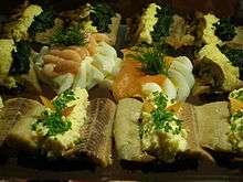Smørrebrød (originally smør og brød, meaning "butter and bread") usually consists of a piece of buttered rye bread (rugbrød), a dense, dark brown bread. Pålæg (meaning put-on, actually "that which is laid on [the bread]"), the topping, then among others can refer to commercial or homemade cold cuts, pieces of meat or fish, cheese or spreads. More elaborate, finely decorated varieties have contributed to the international reputation of the Danish open sandwich or smørrebrød. A slice or two of pålæg is placed on the buttered bread and decorated with the right accompaniments to create a tasty and visually appealing food item.[20]