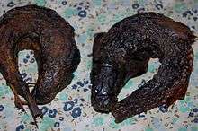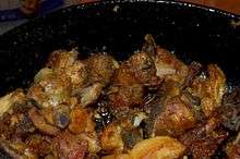Taro root is an important crop in the region. The leaves and roots are eaten. Sidhara[9] is a mixture of taro root, dried fish and turmeric that is formed into cakes and dried for preservation. The cakes are broken up and cooked with radish, chili, garlic and other spices to accompany boiled rice. Snails are cleansed, boiled and spiced to make ghonghi.[10] Another short compendium of Tharu and Maithil recipes[11] includes roasted crab, wheat flatbread fried in mustard oil, and fried taro leaf cakes.