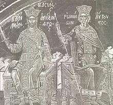 Alexander and Augustus depicted in a Byzantine style painting from 1568. Written on the left is 'Alexander, King of the Hellenes' and 'Augustus, Emperor of the Romans' on the right. From the Katholikon of Docheiariou Monastery, Mt. Athos, Greece.