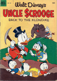 Carl Barks' 1950s Scrooge McDuck comics established the character as a successful participant in the Klondike rush when he was young, around the turn of the century. While Barks was content with leaving Scrooge's backstory of his Klondike days at the level of short flashbacks, his successor Don Rosa has gone to extend Barks's legacy of short glimpses into Scrooge's gold rush exploits into a number of adventure stories, particularly Last Sled to Dawson and individual chapters of his opus magnum The Life and Times of Scrooge McDuck, which are chapter 8a: King of the Klondike, chapter 8b: The Prisoner of White Agony Creek, and chapter 8c: Hearts of the Yukon.