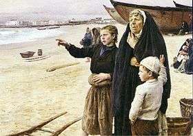 The traditional casamento poveiro (Povoan marriage), in which the newly-wed couple was covered by a fisherman's net and watered with vinho verde in order to bring fortune to the marriage, is becoming a forgotten practice. In Póvoa's tradition (that persists to the present day), the heir of the family is the youngest son (as in old Brittany and Denmark).[12] The younger son is the heir because it was expected that he would take care of his parents when they became old. Also, unlike the rest of the nation, it is the woman who governs and leads the family – this matriarchy is derived from the fact that the man was usually fishing at sea.[13] The Danish professor Heningser noticed that several features in the Povoan fishermen cultural life were similar to those found in the Jutland fjords, one of which, the women's sign of mourning, putting the skirt on the shoulders and throw the head, was found only in Northern Denmark and Póvoa de Varzim.[14]