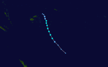 The Regional Specialized Meteorological Center in Nadi, Fiji uses the Australian Tropical Cyclone Intensity Scale which is based on 10-minute sustained winds and three second gusts for its tropical cyclone tracking information, while the Joint Typhoon Warning Center uses 1-minute sustained winds.[2] The conversion factor between the two is 1.14.[3] RSMC Nadi's peak intensity for Lin was 110 km/h, (70 mph) 10-minute sustained, or 130 km/h (80 mph) 1-minute sustained.[3][4] The JTWC's peak intensity for Lin was 95 km/h (60 mph) 1-minute sustained, or 85 km/h (50 mph) 10-minute sustained.[3]