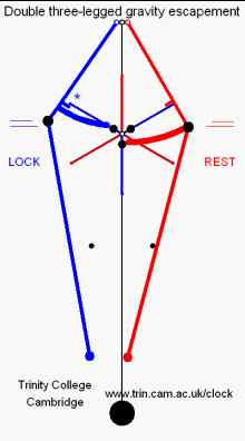 In the animation shown here the two "gravity arms" are coloured blue and red. The two three-legged escape wheels are also coloured blue and red. They work in two parallel planes so that the blue wheel only impacts the locking block on the blue arm and the red wheel only impacts the red arm. In a real escapement these impacts give rise to loud audible "ticks" and these are indicated by the appearance of a * beside the locking blocks. The three black lifting pins are key to the operation of the escapement. They cause the weighted gravity arms to be raised by an amount indicated by the pair of parallel lines on each side of the escapement. This gain in potential energy is the energy given to the pendulum on each cycle. For the Trinity College Cambridge Clock a mass of around 50 grams is lifted through 3 mm each 1.5 seconds - which works out to 1 mW of power. The driving power from the falling weight is about 12 mW, so there is a substantial excess of power used to drive the escapement. Much of this energy is dissipated in the acceleration and deceleration of the frictional "fly" attached to the escape wheels.