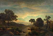 The Düsseldorf school of painting refers to a group of painters who taught or studied at the Düsseldorf Academy (now the Staatliche Kunstakademie Düsseldorf or Düsseldorf State Art Academy) in the 1830s and 1840s, when the Academy was directed by the painter Wilhelm von Schadow.[1] The work of the Düsseldorf School is characterized by finely detailed yet fanciful landscapes, often with religious or allegorical stories set in the landscapes. Leading members of the Düsseldorf School advocated "plein air painting", and tended to use a palette with relatively subdued and even colors. The Düsseldorf School grew out of and was a part of the German Romantic movement. Prominent members of the Düsselorf School included von Schadow, Karl Friedrich Lessing, Johann Wilhelm Schirmer, Andreas Achenbach, Hans Fredrik Gude, Oswald Achenbach, and Adolf Schrödter.[2]