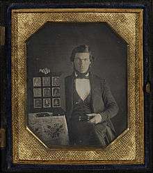 In the US and Britain, the tradition of preserving miniature paintings in a wooden case covered with leather or paper stamped with a relief pattern continued through to the daguerreotype. Some daguerreotypists were portrait artists who also offered miniature portraits. Black-lacquered cases ornamented with inset mother of pearl were sometimes used. The more substantial Union case was made from a mixture of colored sawdust and shellac (the main component of wood varnish) formed in a heated mold to produce a decorative sculptural relief. The word "Union" referred to the sawdust and varnish mixture—the manufacture of Union cases began in 1856.[65] In all types of cases, the inside of the cover was lined with velvet or plush or satin to provide a dark surface to reflect into the plate for viewing and to protect the cover glass.[66] Some cases, however, held two daguerreotypes opposite each other. The cased images could be set out on a table or displayed on a mantelpiece. Most cases were small and lightweight enough to easily carry in a pocket, although that was not normally done. The other approach, common in France and the rest of continental Europe, was to hang the daguerreotype on the wall in a frame, either simple or elaborate.[67][68]