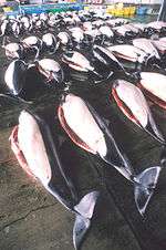 Many Dall's porpoises are killed each year as by-catch in fishing nets. A serious cause of concern is the hunting of the species by harpoon by Japanese hunters. The number of porpoise caught each year rose dramatically following the moratorium on hunting larger cetaceans introduced in the mid-1980s. The greatest number were caught in 1988, when more than 40,000 were taken. International attention to the hunt through a 1990 International Whaling Commission (IWC) resolution resulted in a reduction in numbers caught; however, around 15,000 animals are still caught each year, making it the largest direct hunt of any cetacean species in the world. The hunt has been repeatedly criticized by the IWC and its Scientific Committee, most recently in 2008.[14] A quota of just over 16,000 individuals per year is now in effect. In addition, unknown numbers of animals are struck and lost or caught as by catch. Despite these threats, Dall's porpoise remains a fairly common species with productive populations.