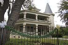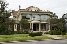 Daniel H. Caswell came to Austin from Nashville, Tennessee, about 1895. He purchased a cotton oil manufacturing company, bought and sold cotton, and in 1899 built a cotton gin. When completed for his family in 1900, this house was located in the far northwest corner of the city. The Caswell house, which exhibits influences of late Victorian, Colonial Revival, and Chateauesque style, features a corner turret and porches supported on rusticated piers. Recorded Texas Historic Landmark-1984[2]