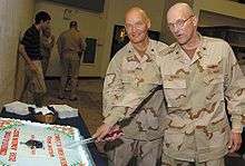 On April 2, 2009, Thomas defended inviting visiting VIP entertainers to view detainees at Guantanamo.[3] Miss Universe 2008 Dayana Mendoza and Miss USA 2008 Crystle Stewart had both been invited to visit Guantanamo on a USO tour, where they signed autographs. Both women stirred controversy after they published accounts of their visits. Thomas had authorized the women to view captives.[4][5][6][7][8] Carol Rosenberg, reporting in the Miami Herald, wrote that Thomas "brushed aside" concerns that by allowing civilians to view the captives he was violating the clause in the Geneva Conventions that protect captives from the humiliation of public display.