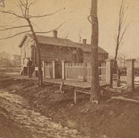 The cottage of Catherine and Patrick O'Leary, 137 (now 558) W. DeKoven St. As this view suggests, the neighborhood was congested with mean wooden buildings and a variety of industry, a condition which helped to spread the fire of 1871 as rapidly as it did. A strong wind blowing towards the northeast spared the O'Leary cottage and the buildings seen here to its west. From a stereoptican view by A.H. Abbott, Photographer, whose studio at 976 (now 2201) N. Clark Street was consumed by the flames.