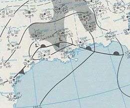 With a storm track very close to the shore and a retreating high-pressure area to the northeast, onshore winds allowed temperatures to warm above freezing in eastern and northern New England. A frontal boundary between the warm Atlantic air and a residual wedge of colder air over the interior served as the focus for a severe ice storm in central New England.[8] Thunder and lightning accompanied the precipitation in some areas.[11][12] By 12:00 UTC on December 27, the attendant upper-level trough matured into a closed cold-core low.[1] The nor'easter continued to drift toward the east-northeast over the next 24 hours.[8]