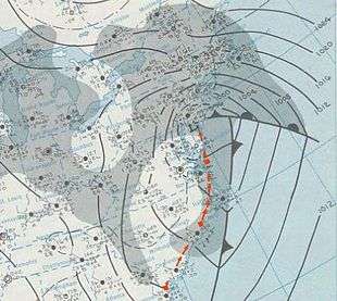 Before the cyclone's arrival, a 1,033 hPa (30.5 inHg) high-pressure area situated north of New England funneled very cold air into the region; the −22 °F (−30 °C) air temperature at Albany, New York, on December 25 still holds the record for the city's coldest December temperature.[7] On December 25 and 26, extensive cold air damming and frontogenesis occurred along the U.S. East Coast. The high-pressure area slowly retreated as the storm approached.[8]