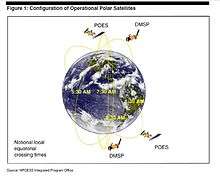 The Defense Meteorological Satellite Program (DMSP) monitors meteorological, oceanographic, and solar-terrestrial physics for the United States Department of Defense. The program is managed by the Air Force Space Command with on-orbit operations provided by the National Oceanic and Atmospheric Administration.[1] The (originally classified) mission of the satellites was revealed in March 1973. They provide cloud cover imagery from polar orbits that are sun-synchronous at nominal altitude of 450 nautical miles (830 km).[2]