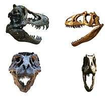 Tyrannosaurid skull anatomy is well understood as complete skulls are known for all genera but Alioramus, which is known only from partial skull remains.[9] Tyrannosaurus, Tarbosaurus, and Daspletosaurus had skulls which exceeded 1 metre (3 ft 3 in) in length,[7] The largest discovered Tyrannosaurus skull measures up to 1.45 metres (4 ft 9 in) long.[10] Adult tyrannosaurids had tall, massive skulls, with many bones fused and reinforced for strength. At the same time, hollow chambers within many skull bones and large openings (fenestrae) between those bones helped to reduce skull weight. Many features of tyrannosaurid skulls were also found in their immediate ancestors, including tall premaxillae and fused nasal bones.[4]