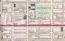 The 1800, 2000, and 2100 ‘Federal’ blocks comprise mostly Civil War–era houses built in the style of the earlier Federal Period (1785–1815) and are characterized by red brick facades, white marble trim, and semicircular fanlights above doorways.[9][10] Most of the original houses remain today, especially on the 1800 and 2000 blocks where they are palatial in size, giving those blocks a historical atmosphere.[1] The 1800 block opened 1853–55 [1][11] followed by construction of an initial row of 9 houses (nos. 1800–1818) in 1857 [12][13] and the entire block was complete and occupied by the end of 1860.[7][14] The 2000 block opened in 1860 [14] and is 25% longer than typical blocks in Philadelphia, a holdover from the early symmetrical grid having a wider street near each river.[6][15][16] A row of 9 houses (nos. 2000–2018) listed in the National Register of Historic Places was complete and occupied by 1864.[7][17] The Rosenbach Museum is located in two of these (nos. 2008–2010). After a short pause in construction for several years, the rest of the 2000 block was done by circa 1870 [17][18][19][20] and included some red brick houses, especially on the north side, with brownstone trim and bracketed window hoods and thus mixing Federal and Second Empire (Victorian) styles. Overall, houses on the 1800 and 2000 blocks are similar in having four stories, but the top floors on the 2000 block (some added later) are set back with dormers, giving an illusion of 3-story houses and allowing more light on the street. Houses in the 2100 block, initially called ‘Walter Street,’ were built during 1859–1865, starting with the north side.[13][14][17] They also have mostly Federal-style houses but are somewhat smaller and more variable, reflecting subsequent changes.
