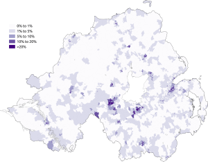 Foreign languages. Map showing the percentage of people whose main language was other than English or Irish (Gaelic) in the 2011 census. Those stating Ulster Scots as their main language were negligible in number and not analysed geographically by NISRA.