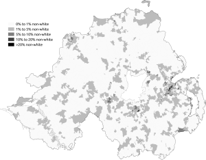 In 2001, 91.0% of the population were born in Northern Ireland, 7.2% were born in other parts of the UK and Ireland, and 1.8% were born elsewhere. By 2011, the number of immigrants from outside the UK and Ireland had risen to 4.3%, while the number born within them fell to 6.7%. The highest number of non-British/non-Irish immigrants are in Belfast, followed by Craigavon Urban Area and Dungannon. Dungannon has a bigger share of immigrants than any town in Northern Ireland, while Strabane has the smallest share of these immigrants.[5]