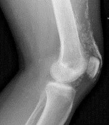 Gottron's sign. Confluent macular erythema with scale confined to the skin overlying the patellae in a girl with juvenile dermatomyositis.