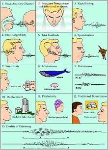 Vocal-auditory channel Refers to the idea that speaking/hearing is the mode humans use for language. When Hockett first defined this feature, it did not take sign language into account, which reflects the ideology of orality that was prevalent during the time . This feature has since been modified to include other channels of language, such as tactile-visual or chemical-olfactory.