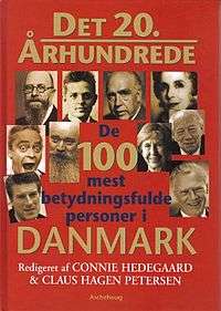 The Det 20. århundrede – De 100 mest betydningsfulde personer i Danmark (20th Century - The 100 most important people in Denmark) is a 1999 biographical encyclopedia book drawn up by Connie Hedegaard and Claus Hagen Petersen on the most significant Danes of the 20th century.[1] The inclusion is of course subjective and debatable.