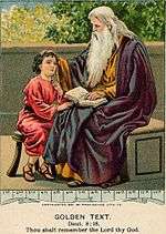 God made the Israelites travel the long way in the wilderness for 40 years to test them with hardships to learn what was in their hearts and whether they would keep God's commandments.[12] God subjected them to hunger and then gave them manna to teach them that man does not live on bread alone, but on what God decrees.[13] Their clothes did not wear out, nor did their feet swell for 40 years.[14] God disciplined them as a man disciplines his son.[15] Moses told the Israelites that God was bringing them into a good land, where they might eat food without end, and thus when they had eaten their fill, they were to give thanks to God for the good land that God had given them.[16] The first reading (עליה, aliyah) ends here.[17]